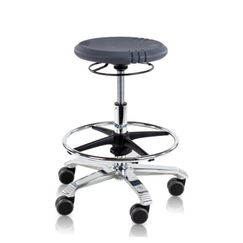 De compact vormgegeven Opti Line is een prettige partner in het lab. De zitting van Ø 35 cm is gemaakt van zacht polyurethaan, bestand tegen chemische stoffen en gemakkelijk te reinigen. Het aluminium onderstel van Ø 54 cm is voorzien van grote wielen. Doordat hij zo compact is past de Opti Line taboeret gemakkelijk onder een labtafel en geeft hij je de ondersteuning die nodig is. De ring onder de zitting voor de hoogteverstelling zorg dat u nooit mis grijpt.