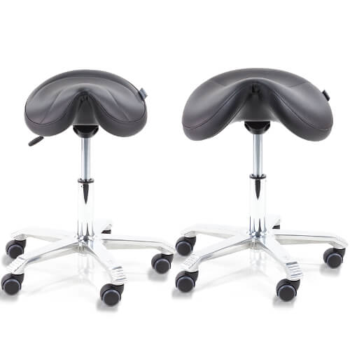 De zadelkrukken van Score zijn verkrijgbaar in 2 modellen, de Amazone en de Jumper. De Amazone heeft een smallere zitting (34 cm) dan de Jumper (44 cm). De zadels worden voor deze actie uitgerust met een verstelbare zithoek en je hebt de mogelijkheid een lendensteun toe te voegen. De zittingen (en lendensteun) zijn voorzien van zeer hoogwaardige antibacteriële Stamskin bekleding (zwart). Bij het optimaal gebruik van het zadel wil je de heuphoek zo groot mogelijk maken (minimaal 110 graden).